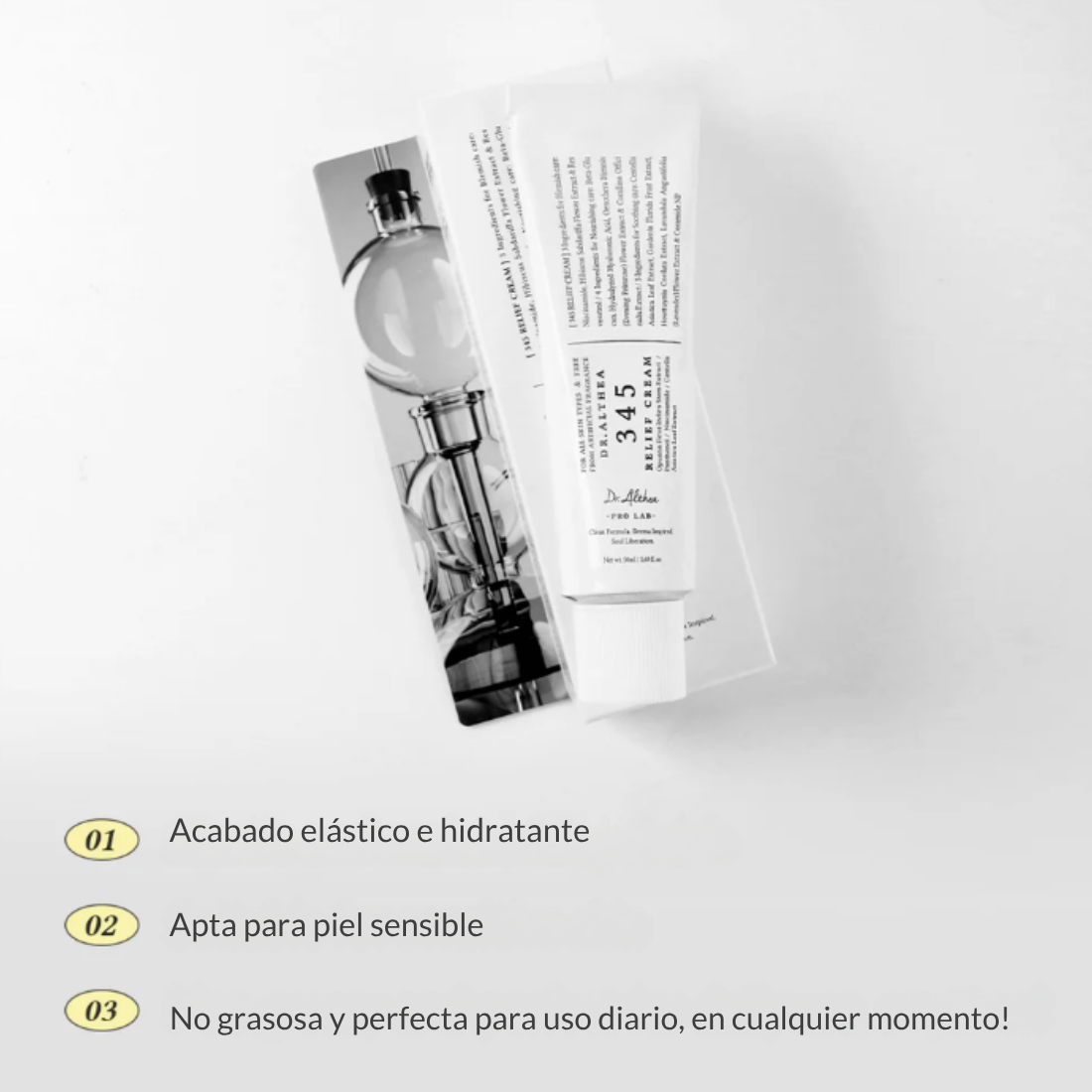 345 Relief Cream combina Niacinamida, Pantenol y extractos botánicos calmantes para reparar, hidratar y fortalecer la piel desde la primera aplicación.