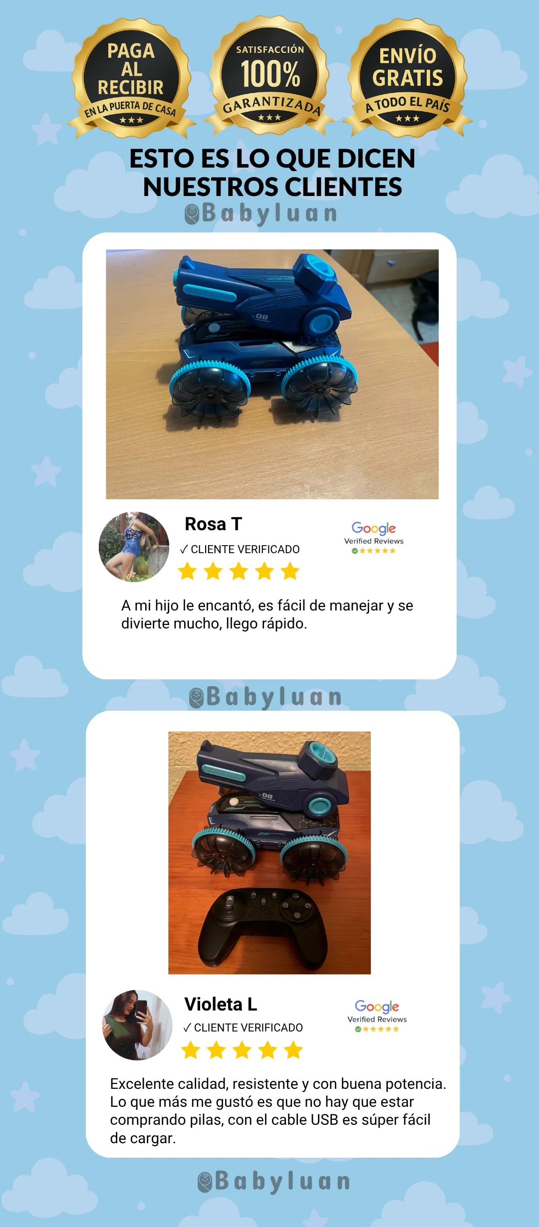 Con luces LED, tracción total y chorros de agua, este carro anfibio convierte cualquier terreno en pura diversión.
